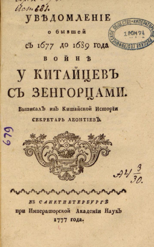 Леонтьев, Алексей Леонтьевич (1716-1786). Уведомление о бывшей с 1677 до 1689 г. войне у китайцев с зенгорцами / выписал из китайской истории секретарь Леонтьев. - Санкт-Петербург : При Имп. Акад. наук, 1777