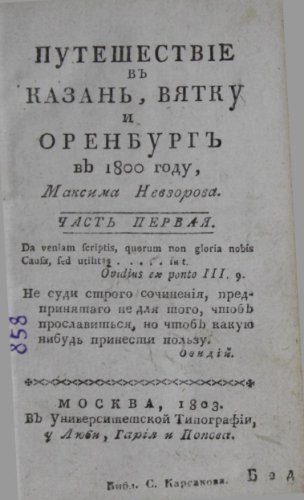 Невзоров, Максим Иванович (1763-1827). Путешествие в Казань, Вятку и Оренбург в 1800 году, Максима Невзорова. Ч. 1. - Москва : В Универ. тип., у Люби, Гария и Попова, 1803