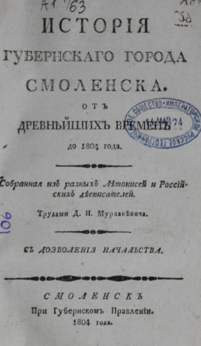 Мурзакевич, Никифор Адрианович (1769-1834). История губернского города Смоленска от древнейших времен до 1804 года / собр. из разных летописей и российских дееписателей трудами д[ьякона] Н. Мурзакевича. - Смоленск : При Губернском правлении, 1804