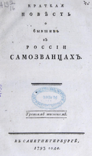Щербатов, Михаил Михайлович (1733-1790). Краткая повесть о бывших в России самозванцах. - 3-м тиснением. - Санкт-Петербург, 1793