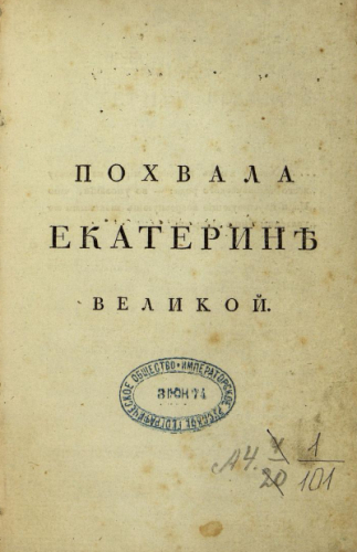 Захаров, Иван Семенович (1754-1816). Похвала Екатерине Великой. / [Сочинил сенатор Захаров]. - [Санкт-Петербург : Печ. в тип. Шнора, 1802]
