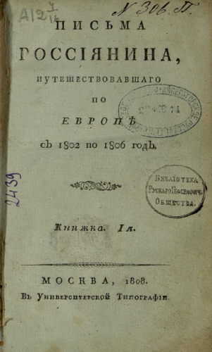 Горихвостов, Дмитрий Петрович (?-1846). Письма россиянина, путешествовавшего по Европе с 1802 по 1806 год. Кн. 1. - Москва : Универ. тип., 1808
