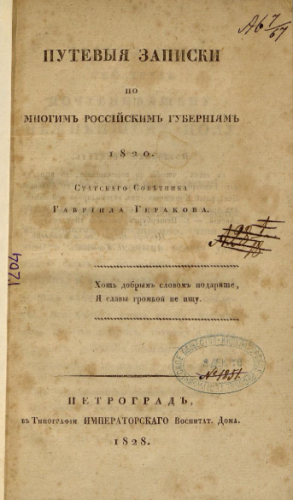 Гераков, Гавриил Васильевич (1775-1838). Путевые записки по многим российским губерниям, 1820 / [соч.] стат. советника Гавриила Геракова. - Санкт-Петербург : Тип. Имп. Воспитательного дома, 1828