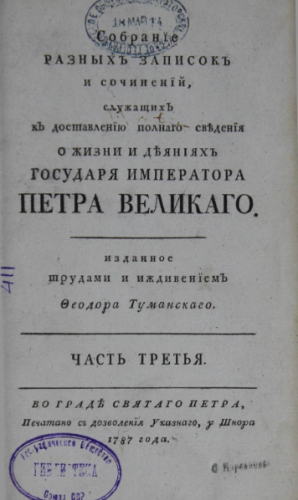 Туманский, Федор Осипович (1746-1810). Собрание разных записок и сочинений, служащих к доставлению полного сведения о жизни и деяниях государя императора Петра Великого. Ч. 3. / Изд. трудами и иждивением Феодора Туманского. - Санкт-Петербург : Печ. у Шнора, 1787