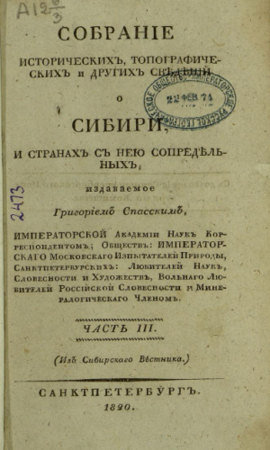 Спасский, Григорий Иванович (1783-1864). Собрание исторических, топографических и других сведений о Сибири и странах с нею сопредельных. Ч. 3 : (Из "Сибирского вестника") / изд. Григорием Спасским, Имп. Санкт-Петербургской Акад наук корр... - Санкт-Петербург, 1820