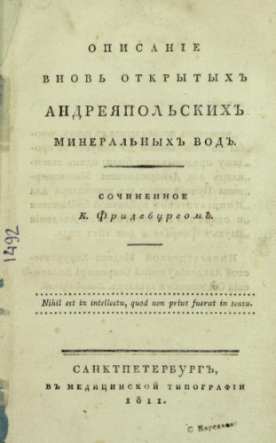Фридебург, Карл Эрнст Эфраим (1786-1835). Описание вновь открытых Андреапольских минеральных вод / Соч. К. Фридебургом. - Санкт-Петербург : Мед. тип., 1811