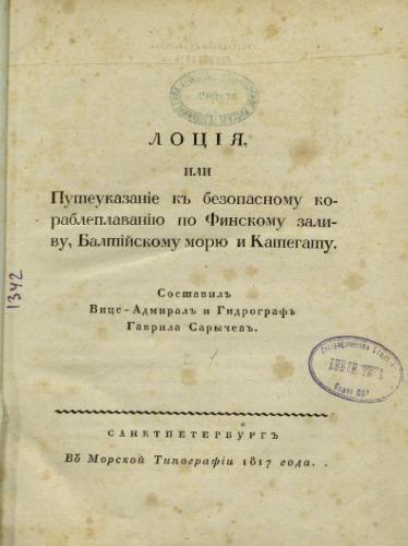 Сарычев, Гавриил Андреевич (1763-1831). Лоция, или Путеуказание к безопасному кораблеплаванию по Финскому заливу, Балтийскому морю и Категату. - Санкт-Петербург : Мор. тип., 1817