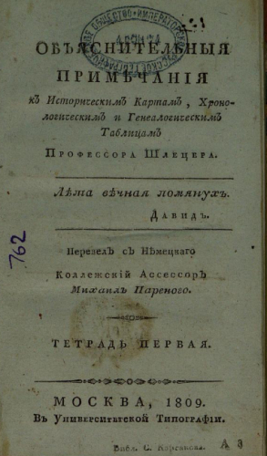 Шлецер, Христиан Август (1774-1831). Объяснительные примечания к историческим картам, хронологическим и генеалогическим таблицам. Тетр. 1. / [соч.] проф. Шлецера ; пер. с нем. коллежский ассесор Михаил Пареного. - Москва : Универ. тип., 1809