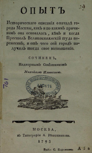 Ильинский, Михаил Иванович (?-1795). Опыт исторического описания о начале города Москвы : как и по каким причинам она основалась, кем и когда престол великокняжеский туда перенесен; и отчего сей город получил тогда свое возвышение / Соч. надворным советником Михайлом Ильинским. - Москва : Тип. А. Решетникова, 1795