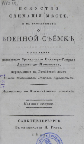 Дюпен де Монтесон, Луи Шарль (ок. 1720-ок. 1790). Искусство снимания мест, и в особенности о военной съемке / соч. известного фр. инженер-географа Дюпен-де-Монтесона ; пер. на российский язык коллеж. советником Петром Бурнашевым. - 2-е изд. - Санкт-Петербург : В тип. Н. Греча, 1824