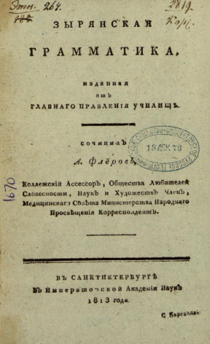 Флеров А. Зырянская грамматика / изд. от Гл. правления училищ ; соч. А. Флеров, коллеж. асессор, О-ва любителей словесности, наук и художеств член, Мед. совета М-ва нар. просвещения корреспондент. - Санкт-Петербург : В Имп. Акад. наук, 1813