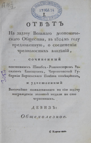Каницкий, Василий. Ответ на задачу Вольного Экономического общества, в 1804-м году предложенную, о соединении чрезполосных владений / соч. отставным штабс-ротмистром Василием Каницким, Черниговской губ. Борзенского повета помещиком. - [Санкт-Петербург] : [не ранее 1805]