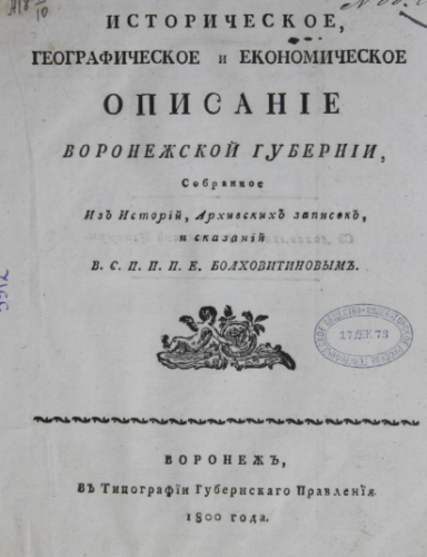 Евгений (Болховитинов, Евфимий Алексеевич; 1767-1837). Историческое, географическое и экономическое описание Воронежской губернии / собр. из историй, арх. записок, и сказаний В[оронежской] с[еминарии] п[рефектом] п[авловским] п[ротоиереем] Е. Болховитиновым. - Воронеж : В тип. Губ. правления, 1800