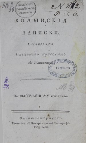 Руссов, Степан Васильевич (1768-1842). Волынские записки / соч. Степаном Руссовым в Житомире. - Санкт-Петербург :Имп. тип., 1809