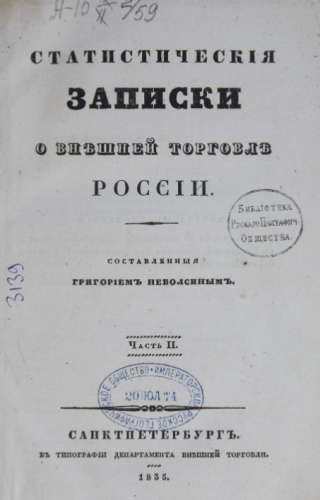 Неболсин, Григорий Павлович (1811-1896). Статистические записки о внешней торговле России. Ч. 2. / сост. Григорием Неболсиным. - Санкт-Петербург : Тип. Деп. внеш. торг., 1835