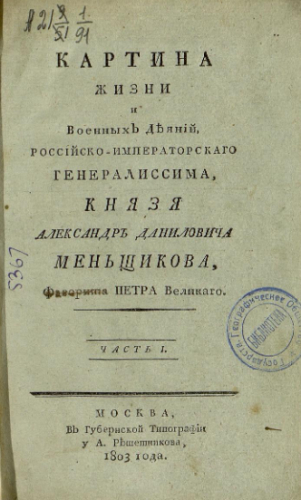 Картина жизни и военных деяний российско-императорского генералиссимуса, князя Александра Даниловича Меньшикова, фаворита Петра Великого. - Москва : В Губернской тип. у А. Решетникова, 1803