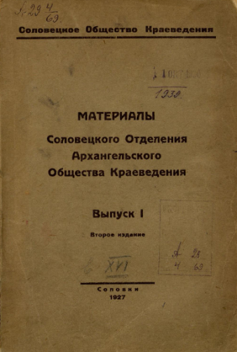 Материалы Соловецкого общества краеведения. Вып. 16 : Материалы Соловецкого Отделения Архангельского Общества Краеведения. Вып. 1. - 2-е изд. - Соловки : Бюро печати УСЛОН, 1927