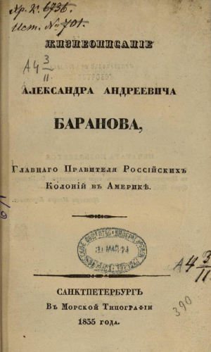 Хлебников, Кирилл Тимофеевич (1776-1838). Жизнеописание Александра Андреевича Баранова, главного правителя российских колоний в Америке. - Санкт-Петербург : Мор. тип., 1835