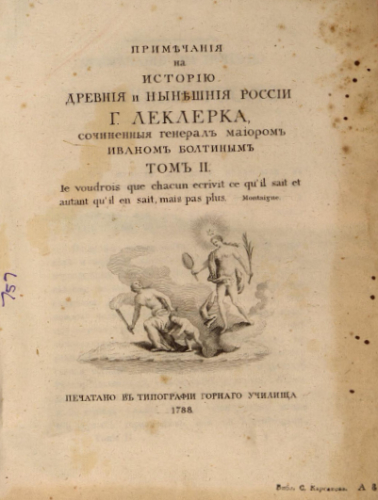 Болтин, Иван Никитич (1735-1792). Примечания на историю древнюю и нынешнюю России г. Леклерка. Т. 2. / Соч. генерал-майором Иваном Болтиным. - [Санкт-Петербург] : Тип. Горного училища, 1788