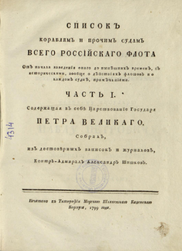Шишков, Александр Семенович (1754-1841). Список кораблям и прочим судам всего российского флота : от начала заведения оного до нынешних времен, с историческими, вообще о действиях флотов и о каждом судне, примечаниями. Ч. 1 : Содержащая в себе царствование государя Петра Великого / Собрал из достоверных записок и журналов контр-адмирал Александр Шишков. - [Санкт-Петербург] : Тип. Мор. шляхет. кадет. корпуса, 1799