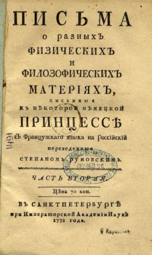 Эйлер, Леонард (1707-1783). Письма о разных физических и философических материях, писанные к некоторой немецкой принцессе. Ч. 2. / с фр. яз. на российский пер. Степаном Румовским. - Санкт-Петербург : При Имп. Акад. наук, 1772