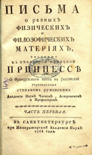 Эйлер, Леонард (1707-1783). Письма о разных физических и философических материях, писанные к некоторой немецкой принцессе. Ч. 1. / с фр. яз. на российский пер. Степаном Румовским Акад. наук чл., астрономом и проф.. - Санкт-Петербург : При Имп. Акад. наук, 1768