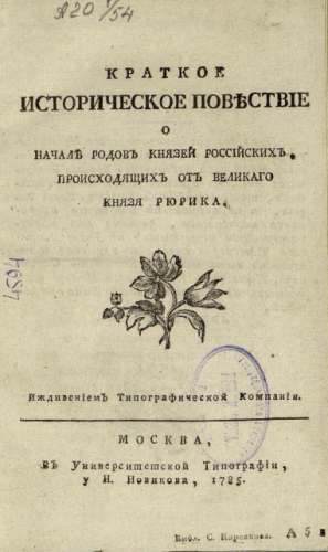 Щербатов, Михаил Михайлович (1733-1790). Краткое историческое повествие о начале родов князей российских, происходящих от великого князя Рюрика / иждивением Типографической компании. - Москва : В Унив. тип., у Н. Новикова, 1785