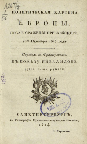Ла Мезонфор, Луи Дюбуа-Декур де (1763-1827). Политическая картина Европы, после сражения при Лейпциге, 18 октября 1813 года / пер. с фр. ; в пользу инвалидов. - Санкт-Петербург : В тип. Правительствующего Сената, 1814