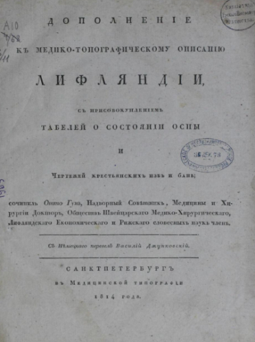 Гун, Отто. Дополнение к медико-топографическому описанию Лифляндии, с присовокуплением табелей о состоянии оспы и чертежей крестьянских изб и бань / Соч. Отто Гун, надворный советник, медицины и хирургии доктор... - Санкт-Петербург : Мед. тип., 1814