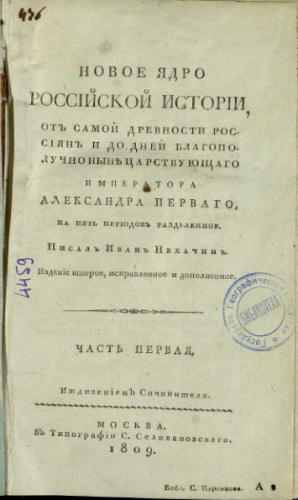 Нехачин, Иван Васильевич (1771-1811). Новое ядро Российской истории, от самой древности россиян и до дней благополучно ныне царствующего императора Александра I, на пять периодов разделенное. Ч. 1. / писал Иван Нехачин. - 2-е изд., испр. и доп. - Москва : В тип. С. Селивановского, 1809