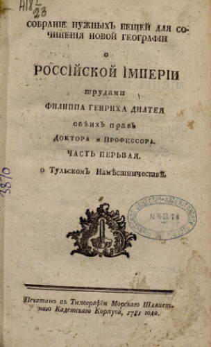 Дильтей, Филипп Генрих (1723-1781). Собрание нужных вещей для сочинения новой географии о Российской империи. Ч. 1 : О тульском наместничестве. / Трудами Филиппа Генриха Дилтея, обеих прав доктора и проф. - [Санкт-Петербург] : Тип. Морск. шляхет. кад. корпуса, 1781