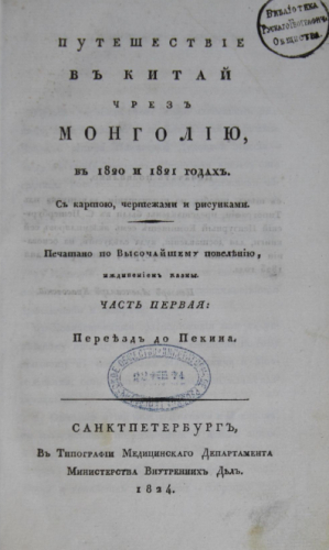 Тимковский, Егор Федорович (1790-1875). Путешествие в Китай через Монголию, в 1820 и 1821 годах. Ч. 1 : Переезд до Пекина. - Санкт-Петербург : Тип. Мед. департ. Мин-ва внутр. дел, 1824