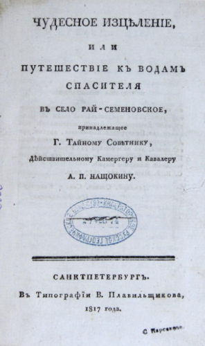 Чиляев, Егор Гаврилович (1790-1838). Чудесное исцеление, или Путешествие к водам спасителя в село Рай-Семеновское, принадлежащее г. тайному советнику, действ. камергеру и кавалеру А.П. Нащокину. - Санкт-Петербург : Тип. В. Плавильщикова, 1817