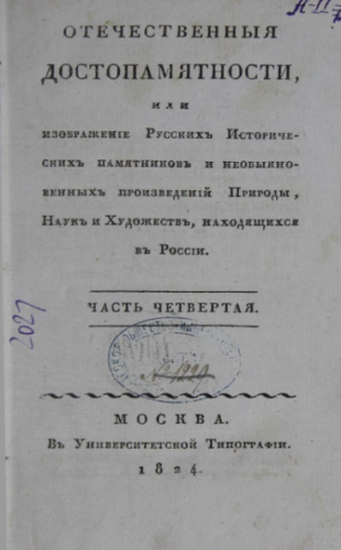 Отечественные достопамятности, или Изображение русских исторических памятников и необыкновенных произведений природы, наук и художеств, находящихся в России. Ч. 4. - Москва : Унив. тип., 1824