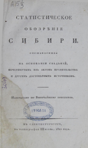 Баккаревич, Михаил Никитич (1775-1819). Статистическое обозрение Сибири / Сост. ст. советником Баккаревичем на основании сведений, почерпнутых из актов правительства и других достоверных источников. - Санкт-Петербург : В тип. Шнора, 1810