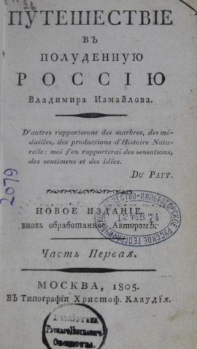 Измайлов, Владимир Васильевич (1733-1830). Путешествие в полуденную Россию. Ч. 1. / [Соч.] Владимира Измайлова ; новое изд, вновь обработанное автором. - Москва : В тип. Христоф. Клаудия, 1805