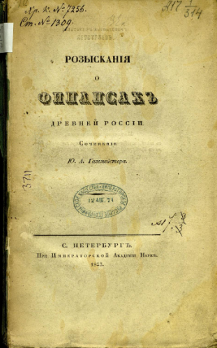 Гагемейстер, Юлий Андреевич (1806-1878). Разыскания о финансах древней России / соч. Ю. А. Гагемейстера. - Санкт-Петербург : При Имп. Акад. наук, 1833