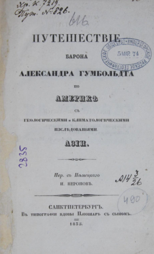 Гумбольдт, Александр (1769-1859). Путешествие барона Александра Гумбольдта по Америке с геологическими и климатологическими исследованиями Азии : Материалы для физиогномики растений. - Санкт-Петербург : Тип. вдовы Плюшар с сыном, 1835