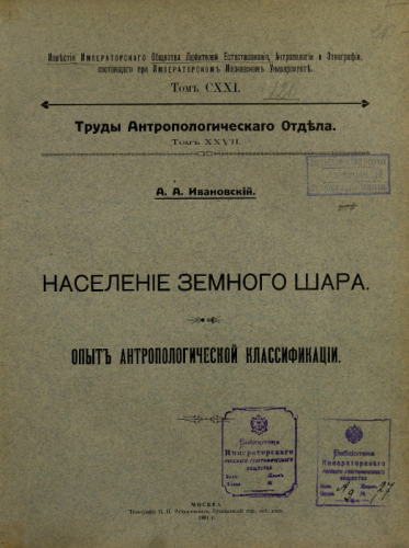 Известия Имп. Общества любителей естествознания, антропологии и этнографии. Т. 121 : Труды Антропологического отдела. Т. 27 : Население земного шара : Опыт антропологической классификации / А.А. Ивановский. - Москва, 1911