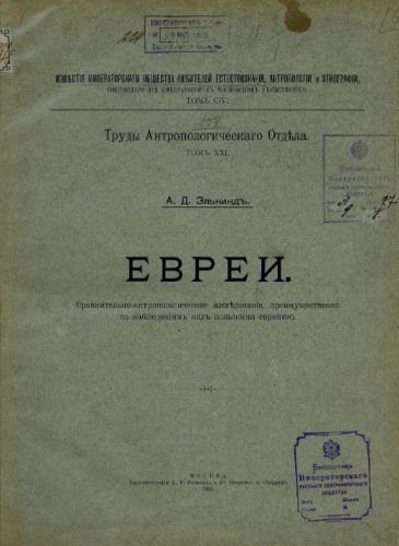 Известия Имп. Общества любителей естествознания, антропологии и этнографии. Т. 104 : Труды Антропологического отдела. Т. 21 : Евреи : (Сравн.-антропол. исслед., преимущественно по наблюдениям над польскими евреями) / А.Д. Элькинд. - Москва, 1903