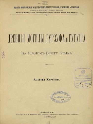 Известия Имп. Общества любителей естествознания, антропологии и этнографии. Т. 64 : Труды Антропологического отдела. Т. 11, Вып. 1 : Древние могилы Гурзуфа и Гугуша (на южном берегу Крыма) / [Соч.] Алексея Харузина. - Москва, 1890