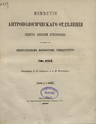 Известия Общества любителей естествознания, антропологии и этнографии. Т. 2 : Известия Антропологического отделения. Т. 1. - Москва, 1865