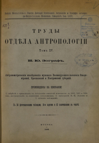 Известия Имп. Общества любителей естествознания, антропологии и этнографии. Т. 76 : Труды Отдела антропологии. Т. 15 : Антропометрические исследования мужского великорусского населения Владимирской, Ярославской и Костромской губерний / Н.Ю. Зограф. - Москва, 1892