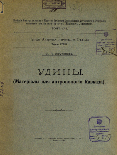 Известия Имп. Общества любителей естествознания, антропологии и этнографии. Т. 106 : Труды Антропологического отдела. Т. 23 : Удины : (Материалы для антропологии Кавказа) / А.А. Арутинов. - Москва, 1905