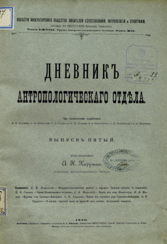 Известия Имп. Общества любителей естествознания, антропологии и этнографии. Т. 68 : Труды Антропологического отдела. Т. 12 : Дневник Антропологического отдела. Вып. 5. - Москва, 1890
