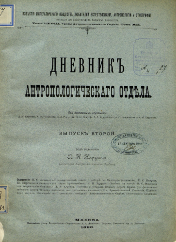 Известия Имп. Общества любителей естествознания, антропологии и этнографии. Т. 68 : Труды Антропологического отдела. Т. 12 : Дневник Антропологического отдела. Вып. 2. - Москва, 1890