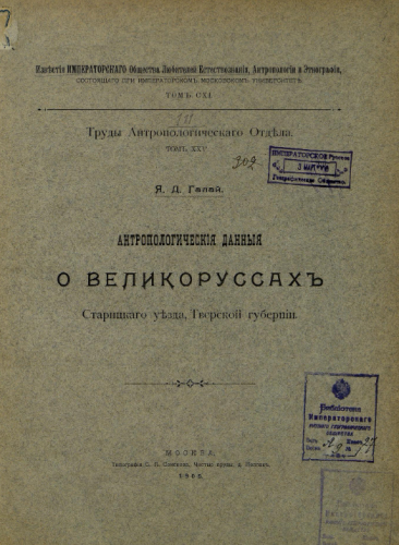 Известия Имп. Общества любителей естествознания, антропологии и этнографии. Т. 111 : Труды Антропологического отдела. Т. 25 : Антропологические данные о великоруссах Старицкого уезда, Тверской губернии / Я.Д. Галай. - Москва, 1905