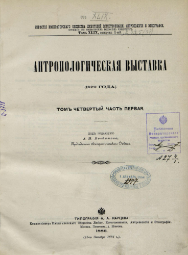 Известия Имп. Общества любителей естествознания, антропологии и этнографии. Т. 49, Вып. 1 : Антропологическая выставка (1879 года). Т. 4, Ч. 1. - Москва, 1886