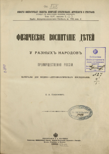 Известия Имп. Общества любителей естествознания, антропологии и этнографии. Т. 45 : Труды Антропологического отдела. Т. 7, Вып. 1 : Физическое воспитание детей у разных народов, преимущественно России : Материалы для медико-антропол. исследования / [соч.] Е.А. Покровского. - Москва, 1884