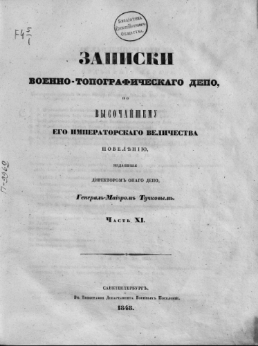 Записки Военно-топографического депо. Ч. XI / изд. ген.-майор. Тучковым. - Санкт-Петербург, 1848